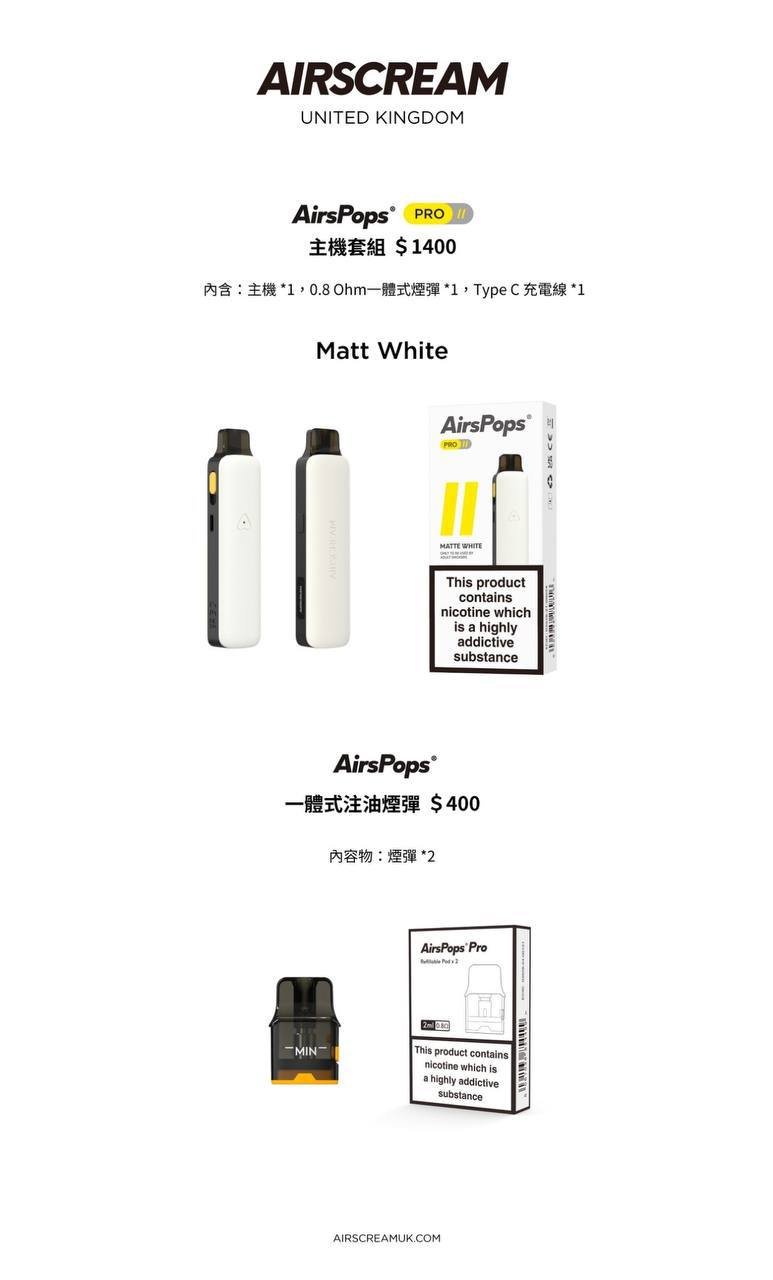 AirsPops Pro II具有永恆的亮白色,為所有電子煙愛好者打造了獨特的AIRSCREAM極簡設計。