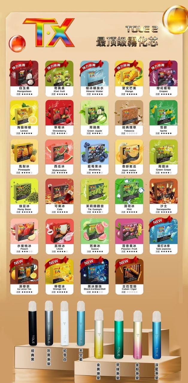 凍檸茶(凍檸七), 古巴雪茄, 可樂冰, 哈密瓜, 奇異果, 愛文芒果, 柳橙冰, 櫻花葡萄, 水蜜桃冰, 沙士, 海鹽檸檬, 白玉果(山竹), 百香果冰, 礦泉水, 經典煙草, 綠豆冰沙, 芭樂冰, 茉莉鐵觀音, 草莓冰, 荔枝冰, 薄荷冰, 藍莓冰, 蘇打冰棒, 西瓜冰, 雪碧, 青提冰(白葡萄), 青蘋果, 鳳梨冰, 黑冰爆珠